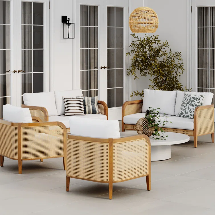 4-Piece Conversation Patio Set, Bohemian Wooden Outdoor Loveseat And Chairs With Cushions