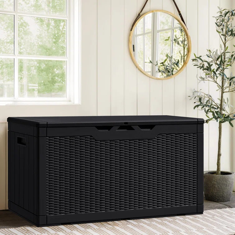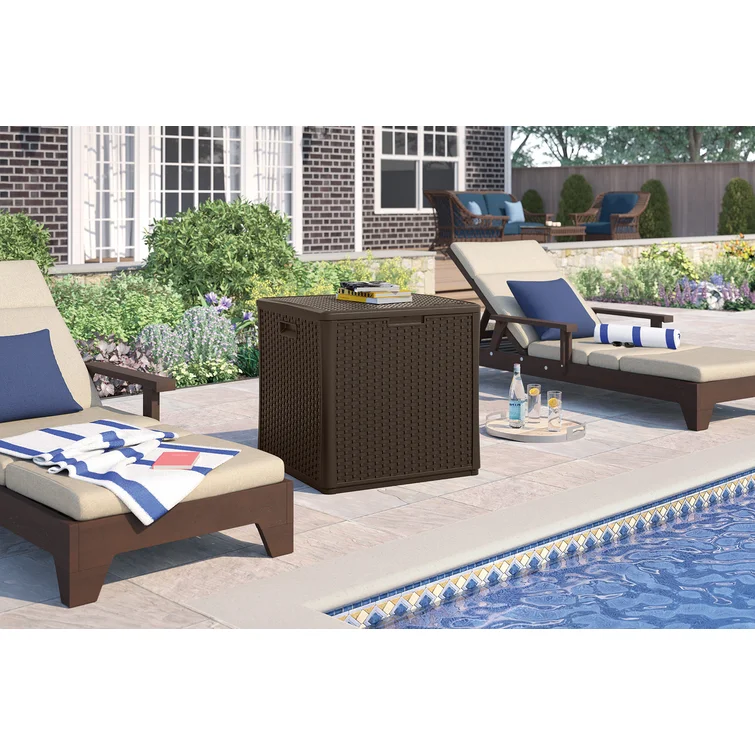 Suncast Wicker 22 Gallon Water Resistant Resin Deck Box with Storage Seat in Java
