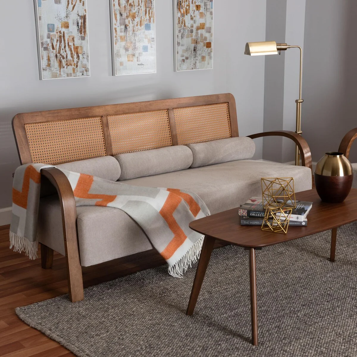 Sage Modern Japandi Light Grey Fabric and Walnut Brown Finished Wood Sofa with Woven Rattan
