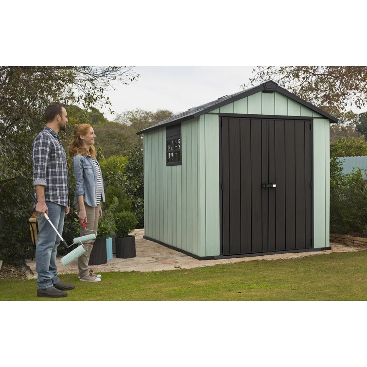 Keter Oakland 7.5x9 ft. Durable Resin Outdoor Storage Shed With Floor and Double Doors for Garden Patio Furniture and Tools, Grey