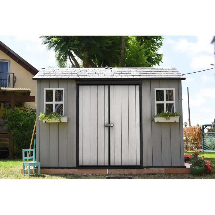 Keter Oakland 11x 7.5 ft. Durable Resin Outdoor Storage Shed With Floor and Double Doors for Garden Patio Furniture and Tools, Grey
