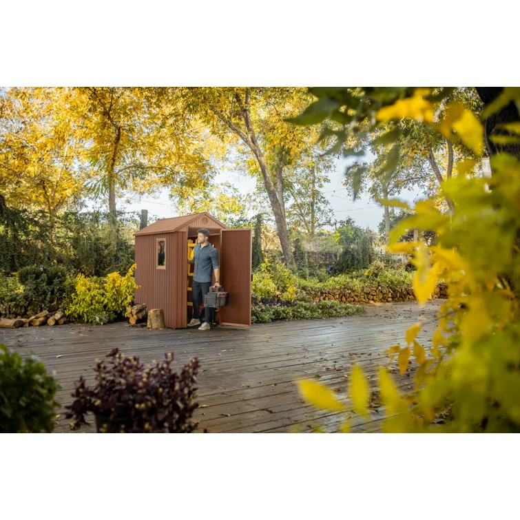 Keter Darwin 4x6 ft. Durable Resin Outdoor Storage Shed With Floor and Double Doors for Garden Patio Furniture and Tools, Brown