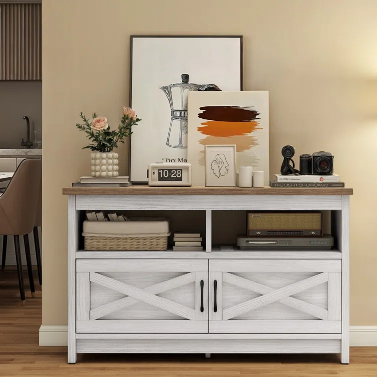 Small Entertainment Center Farmhouse TV Stand Cabinet Media Console Table W/Power Outlets Storage Cabinets